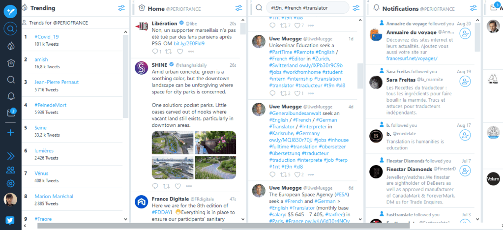 En mettant à jour mon profil Linkedin, j’ai découvert un module intitulé « Community management : Mettre en place sa veille numérique”. Parmi les conseils et outils proposés, la formatrice nous a présenté TweetDeck, que j’ai depuis intégré à mes outils de travail.