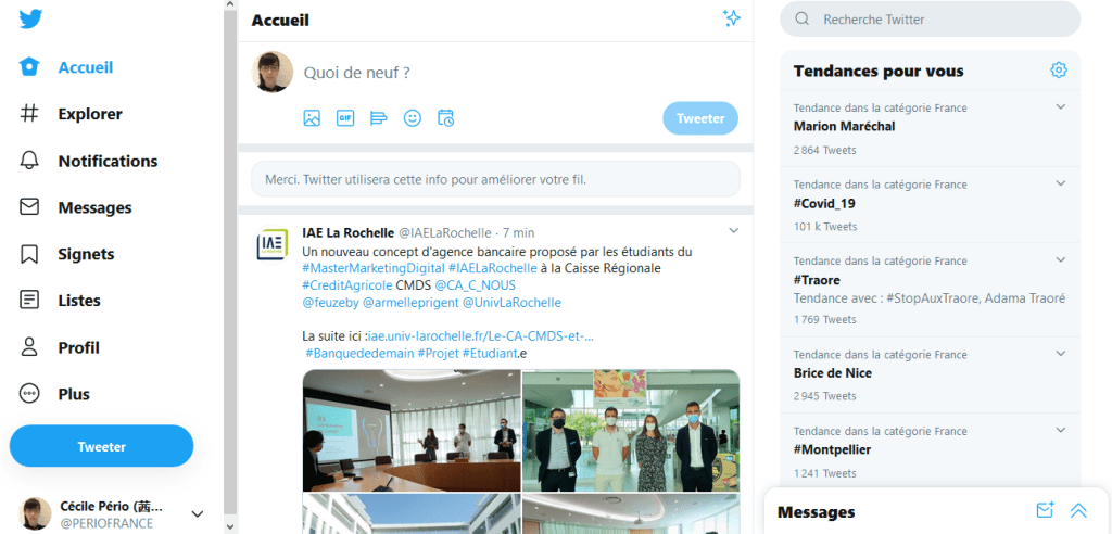 - personnalisez votre affichage, si vous souhaitez suivre un # en particulier, voir afficher vos notifications ou encore suivre les tendances du jour.